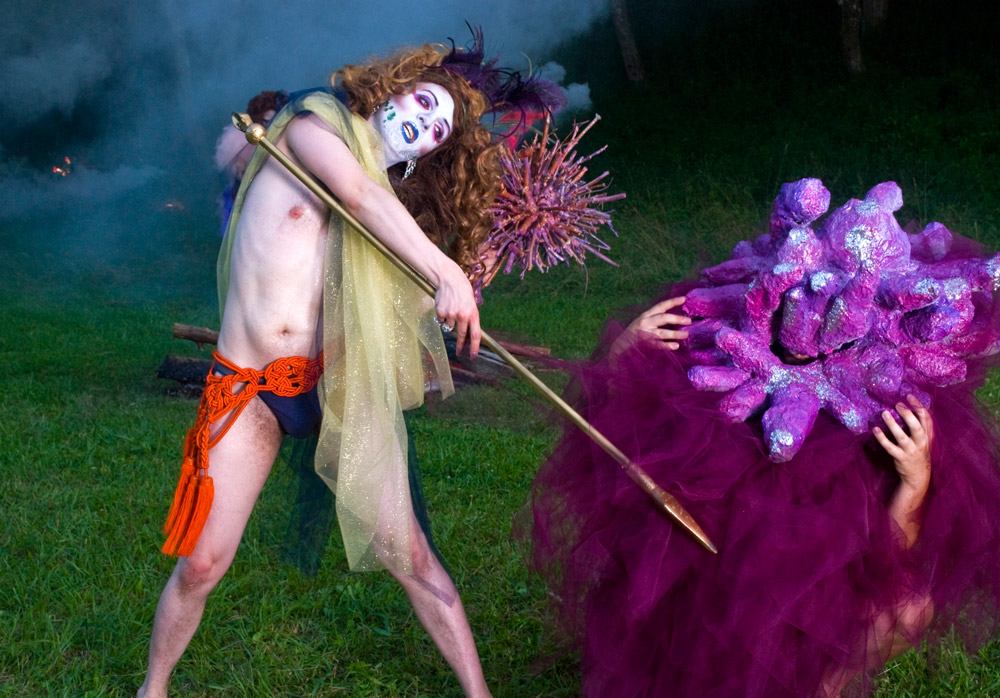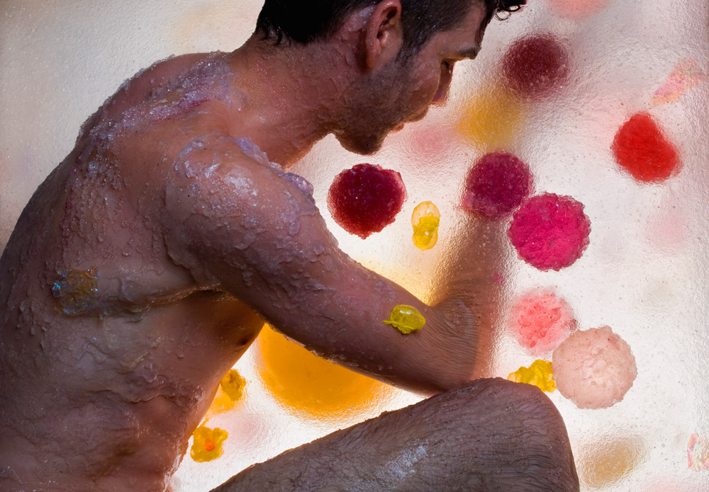 Combining backgrounds in photography, video, abstract painting, performance, and installation, they focus their efforts to create cinematic narratives involving daring drag queens and a bevy of beautiful boys. United by a mutual interest in seductive fashion photography, the chintzy splendor of glitter, and the sparkliest of pop divas, Organza Orgazmica produces work that exists in a space between photography, installation, and performance, as characters sensually interact with their constructed environments.