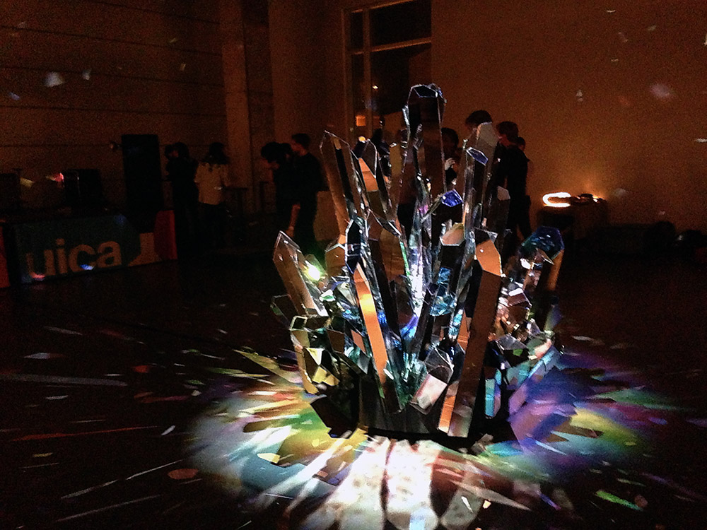 Glimmer was a sculptural Installation by Scott Andrew and Jonathan Armistead. See the future, not as a distant apocalyptic dystopia, but as a playful shimmering reality that you can shape. This sculptural installation combines kinetic sculpture, video, and sound, by chronicling visions of the future through media from the past. The primary focus of this project involved the construction of a rotating mirrored crystal structure that is 6’ tall by 5’ in diameter. The crystal serves as a mash up between the crystal ball and a disco ball, by forecasting visions of the future in a setting that is referential to a dance floor. Four video projections reflect off of the crystal, enveloping the gallery in an optical swarm of video fragments that have the ability to cast viewers into a perceptual juxtaposition of meditation and nausea.