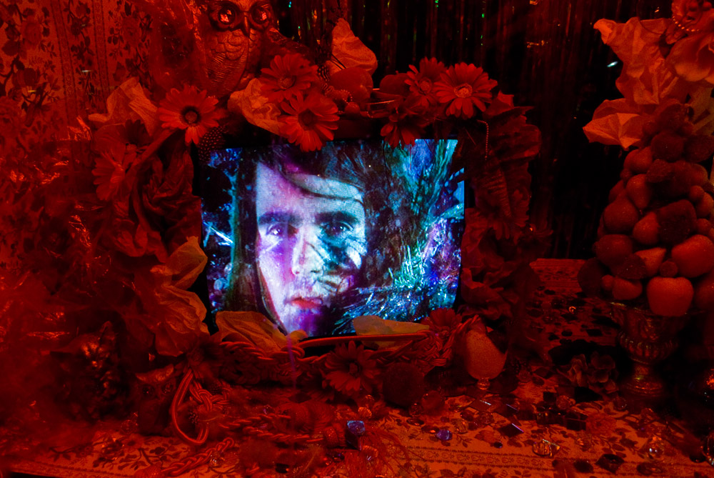 The princess' window held an assortment of objects and materials, representing the character and constructing a personalized interior space for her to inhabit. Artificial fruit and flowers, feathers, painted owl figurines, and tissue paper adorned the dual televisions, obscuring all but the screens, while mirror shards, plastic jewels, ornate wallpaper, and glitter balls were strewn about, all beneath a firery light.
