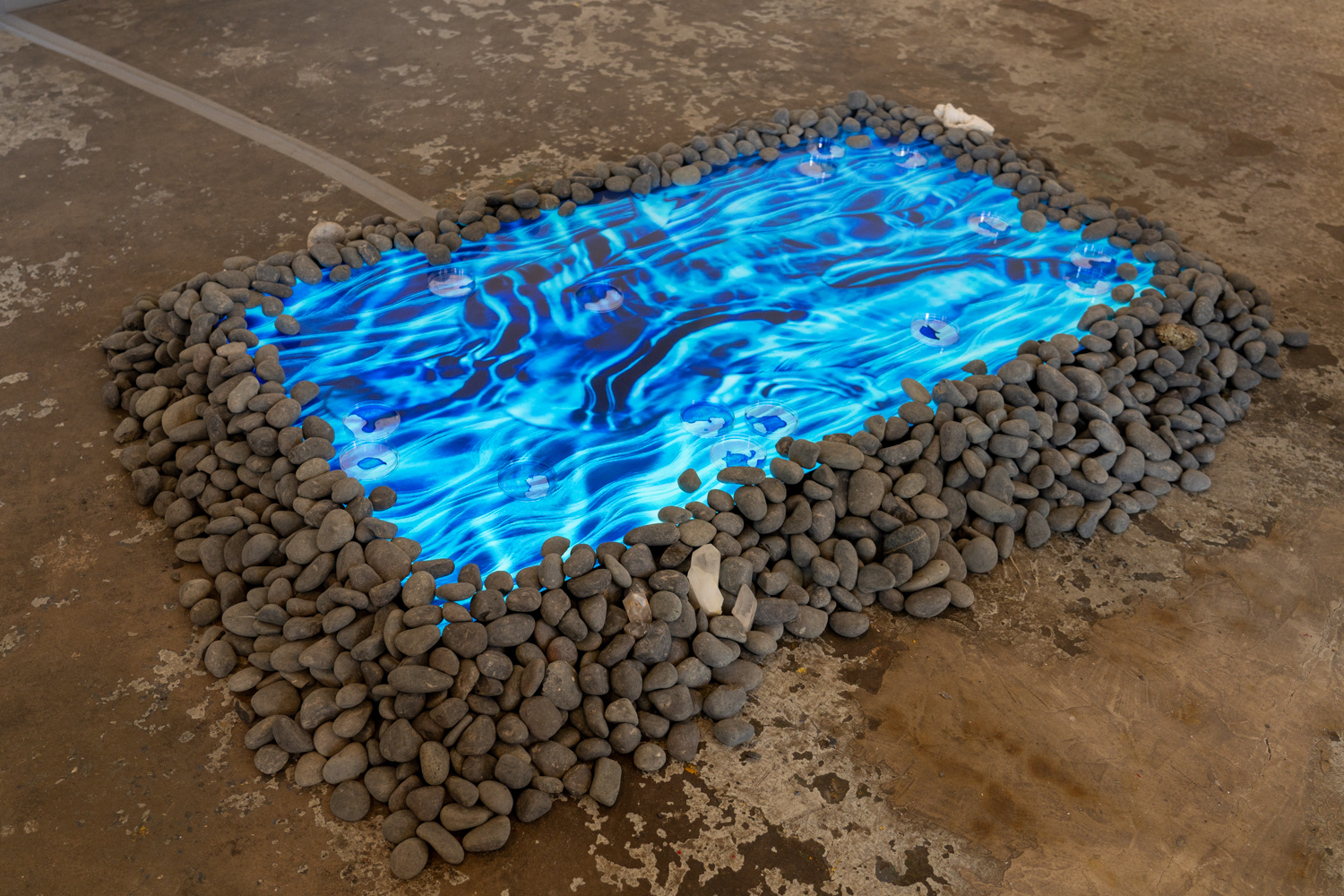 Pulling inspiration from Jongwoo Jeremey Kim’s text Male Bodies Unmade, this work aligns with the multiplicitous analysis of David Hockney’s series of paintings, such as Portrait of an Artist (Pool with Two Figures) and California, that depict gay male bodies in swimming pools and their relationships to narcissism, fluidity, desire, and death. Kim writes, ‘In California, the water’s surface is so opaque as to resist any notion of measurable depth. Neither fully abstract nor fully figurative, it is an ambiguous space that is ceaselessly transitional.’