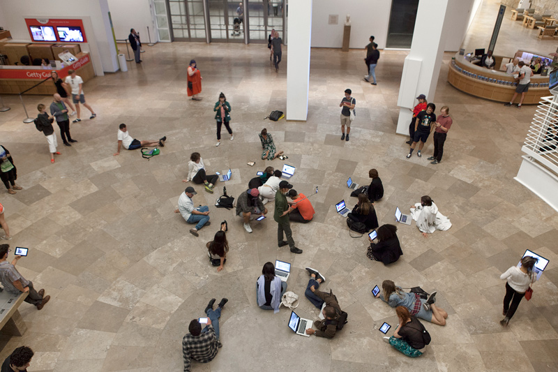 getty1 Other Sky is a project by the Institute for New Feeling, an artist collective including Scott Andrew, Nina Sarnelle, and Agnes Bolt. 50 people wander through the Getty Center at dusk, closely watching the same news network on their phones and laptops. A constructed forecast describes an unprecedented severe weather event predicted to hit Los Angeles that evening. This subtle intervention and expanded video screening weaves a dark, fragmented narrative, while playing with the conventions of screen voyeurism in public space. Only in times of crisis do we see synced content naturally proliferate like this; in tragedy, fear and confusion, we turn to our devices. The performance ends in a communal virtual rain shower meditation.